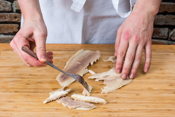Währenddessen das Forellenfilet mit einer Gabel in kleine Stücke zerteilen. Vorsicht! Forellenfilets können Gräten besitzen. Diese am besten beim Zubereiten mit einer Pinzette oder einer Flachzange herausziehen. Den Kerbel grob hacken.