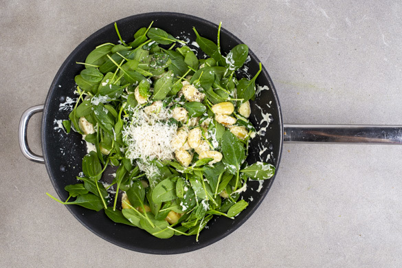 Den Käse untermischen und alles 1–2Min. bei niedriger Hitze sanft köcheln lassen, bis der Spinat zusammengefallen ist. Die restliche Brühe unterrühren, falls die Sauce zu dickflüssig ist. Mit Salz und Pfeffer abschmecken. Den Schinken in mundgerechte „Chips“ brechen und die Gnocchi-Pfanne mit den Schinkenchips und den Lauchzwiebeln garniert servieren.