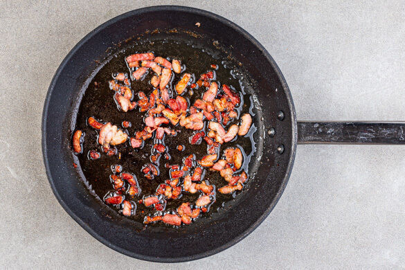 In einem großen Topf ausreichend gesalzenes Wasser für die Pasta zum Kochen bringen. Die Baconstreifen in einer großen Pfanne mit 2EL Olivenöl bei mittlerer Hitze ca. 2Min. anbraten.