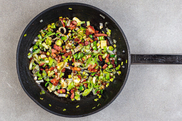 Den Lauch längs halbieren und quer in feine Streifen schneiden. In die Pfanne zu dem Bacon geben und 5–6Min. mitbraten, bis der Lauch weich ist.