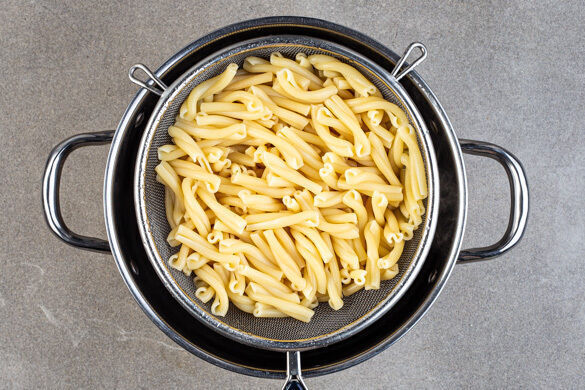 Die Pasta in das kochende Wasser geben und in 6–8Min. bissfest kochen. Mit einem Messbecher ca. 300ml Pastawasser abschöpfen. Die Pasta in ein Sieb abgießen, abtropfen lassen und zurück in den Topf geben.