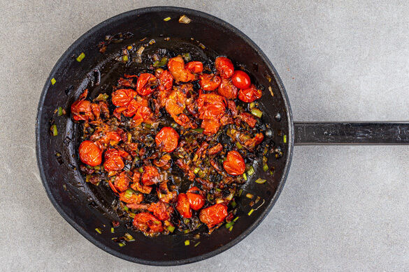 Die Kirschtomaten in die Pfanne zu dem Lauch geben und unter gelegentlichem Rühren 3–4Min. braten, bis sie aufplatzen, dann die Pfanne vom Herd nehmen.