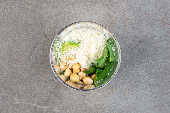 Die Avocados halbieren und den Kern entfernen. Das Fruchtfleisch mit einem Löffel aus der Schale lösen und in ein hohes Gefäß geben. Den Knoblauch schälen und grob würfeln. Den Käse fein reiben. Das Basilikum samt Stängeln grob schneiden und mit dem Knoblauch, den Haselnüssen, 2/3 des Käses, 2EL Olivenöl und 1EL Essig zu der Avocado geben.