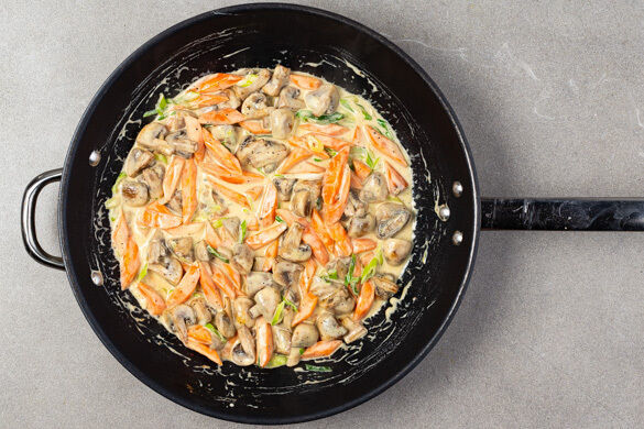 Die Pilze in der Pfanne mit 3EL Olivenöl bei starker Hitze 2–3Min. anbraten. Die Karotten und die Lauchzwiebeln zugeben und 1–2Min. mitbraten. Mit 200ml Wasser ablöschen und 2–3Min. garen, bis das Wasser fast verdampft ist und die Karotten bissfest sind. 3/4 der Crème fraîche unterrühren und mit dem restlichen Bratkartoffelgewürz sowie Salz und Pfeffer abschmecken.