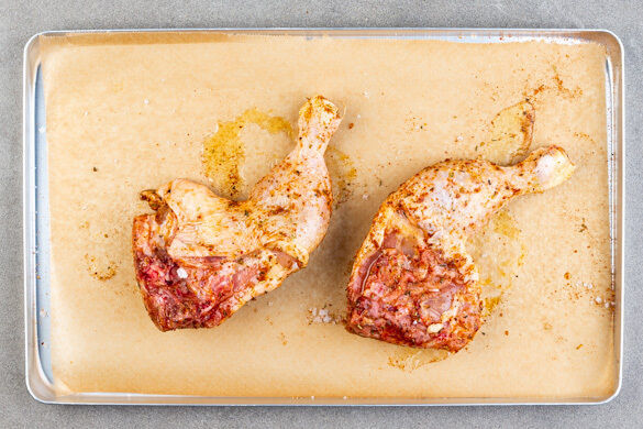 Den Backofen auf 250°C (230°C Umluft) vorheizen. Das Fleisch trocken tupfen und mit der 1/2 des Bratkartoffelgewürzes, 2–3EL Olivenöl und je 1 kräftigen Prise Salz und Pfeffer einreiben. Das Fleisch mit der Hautseite nach unten auf ein mit Backpapier ausgelegtes Backblech geben und im vorgeheizten Ofen 30–35Min. goldbraun und gar backen. Nach der Hälfte der Zeit wenden.