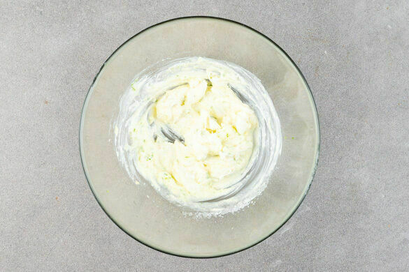 Den Frischkäse mit dem Ingwer, 2TL Limettenschale, 2EL Limettensaft und 4EL Zucker verrühren.
