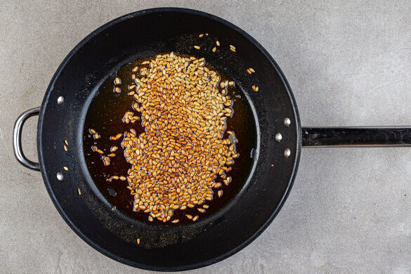 Die Sonnenblumenkerne in einer großen Pfanne ohne Zugabe von Fett bei mittlerer Hitze 1–2Min. goldbraun anrösten. Vorsicht, sie können schnell zu dunkel werden. Die 1/2 des Kreuzkümmels mit 2TL Olivenöl hinzufügen und unter Rühren ca. 30Sek. mitbraten. Zum Abkühlen aus der Pfanne nehmen, mit 1 Prise Salz würzen und beiseitestellen.