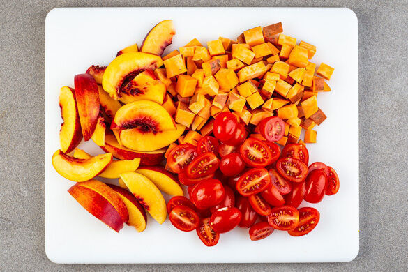 Die Süßkartoffeln samt Schale in ca. 1,5cm große Würfel schneiden. Die Nektarinen rundherum einschneiden und die Hälften auseinander drehen. Das Fruchtfleisch in ca. 2cm breite Spalten schneiden, den Stein entfernen. Die Kirschtomaten halbieren.