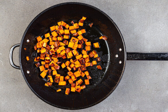 Die Süßkartoffeln in der Pfanne mit 2EL Olivenöl und 1TL Salz bei mittlerer Hitze ca. 5Min. ohne Rühren anbraten, bis sie leicht gebräunt sind. 2EL Wasser in die Pfanne geben und die Süßkartoffeln abgedeckt in 7–9Min. weich garen, dabei gelegentlich umrühren.