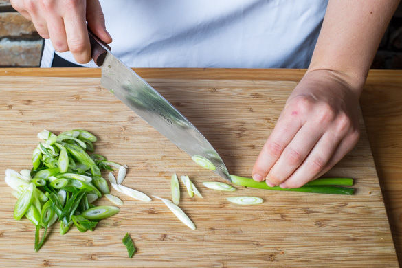 Die Paprika halbieren, entkernen und mit 1EL Olivenöl sowie etwas Salz einreiben. Mit der Schnittseite nach unten auf ein mit Backpapier belegtes Backblech geben und im Ofen ca. 15–20Min. rösten, bis die Haut anfängt, Blasen zu werfen. Die Lauchzwiebel in feine Ringe schneiden.