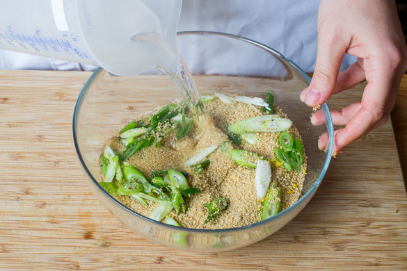 In einem Wasserkocher 250ml Wasser zum Kochen bringen. Den Couscous in einer großen Schüssel mit 1TL Zitronenabrieb, den Lauchzwiebeln und 1EL Olivenöl mischen, mit Salz und Pfeffer würzen, mit dem kochenden Wasser überbrühen und abgedeckt ca. 8–10Min. ziehen lassen.
