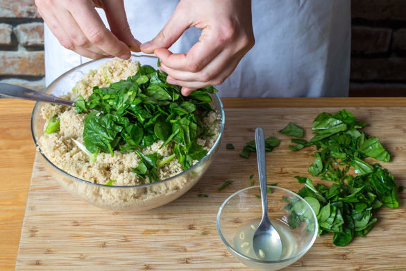 Sobald der Couscous das Wasser aufgesogen hat, mit einer Gabel auflockern. Den Babyspinat grob hacken und unter den Couscous heben. Nach Geschmack mit Zitronensaft abschmecken.