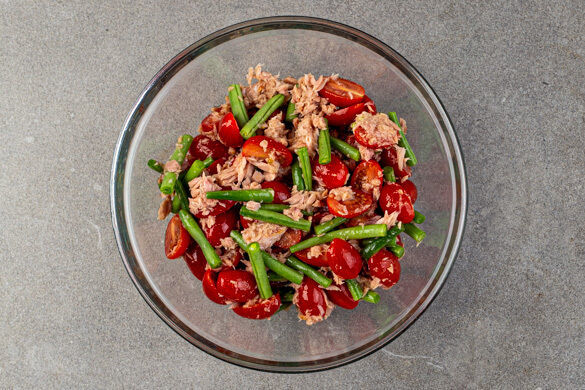 Den Backofen auf 200°C (180°C Umluft) vorheizen. Die Bohnen von den Enden befreien, dann dritteln. Die 1/2 der Tomaten halbieren. Den Thunfisch samt Öl mit den Bohnen, den halbierten Tomaten sowie je 1 Prise Salz und Pfeffer vermengen.