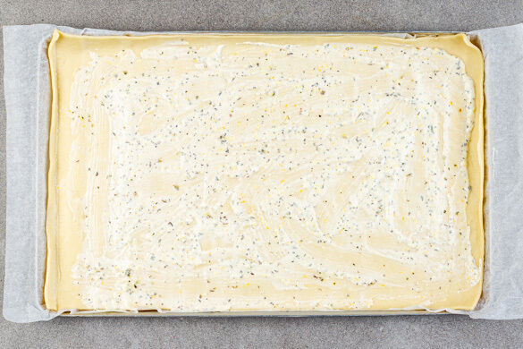 Die Teige mit dem Papier nach unten auf zwei Blechen ausrollen. Die Zitronenschalen abreiben, die Zitronen halbieren und auspressen. Den Knoblauch schälen und fein würfeln oder reiben. Die Zitronenschale, 1EL Zitronensaft und den Knoblauch mit dem Oregano und 6EL Mayonnaise verrühren. Die Sauce mit Salz und Pfeffer abschmecken und auf die Teige streichen.