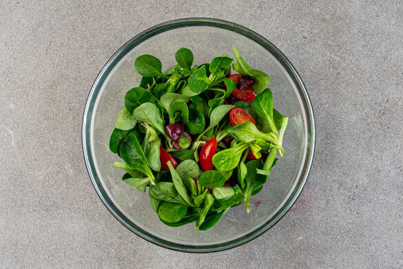 Die Oliven grob schneiden. Die restlichen Tomaten halbieren und mit dem Feldsalat und den Oliven vermengen.