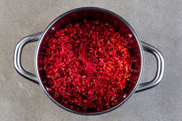 Den Knoblauch und die Kokosflocken in die Pfanne geben und 1–2Min. mitrösten. Die Rote Bete, 1/2TL Salz und 2EL Wasser dazugeben und abgedeckt 2–4Min. garen, bis die Rote Bete weich ist. Anschließend die Hitze auf mittlere bis niedrige Stufe reduzieren, dann den Joghurt unterheben und ca. 1Min. erwärmen. Die Rote Bete unter den Bulgur mengen und abgedeckt warm halten.
