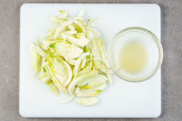 Den Fenchel vom harten Strunk und den Stängeln befreien, evtl. vorhandenes Fenchelgrün für die Garnitur aufbewahren. Den Fenchel längs halbieren und in dünne Streifen schneiden. Die Zitrone halbieren und auspressen.