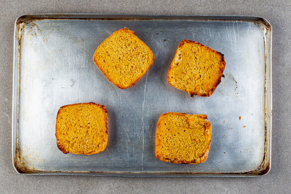 Die Brötchen aufschneiden, mit insgesamt 1EL Butter sowie 1EL Senf bestreichen und im Ofen 6–8Min. aufbacken.