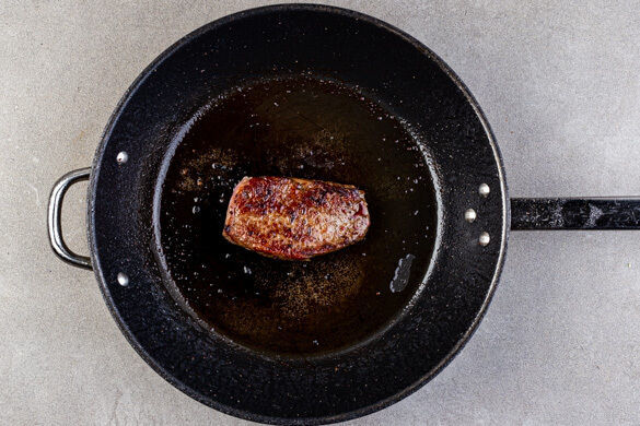 Das Fleisch trocken tupfen, mit Salz und Pfeffer würzen und in einer mittelgroßen Pfanne mit 1EL Olivenöl bei starker Hitze auf der Fettseite 2–4Min. scharf anbraten. Wenden und weitere 2–4Min. braten, je nach Dicke des Fleisches. Die Hitze reduzieren und das Fleisch 1–3Min. abgedeckt garen, je nachdem, ob es medium oder durch sein soll. Abgedeckt auf einem Teller ruhen lassen.