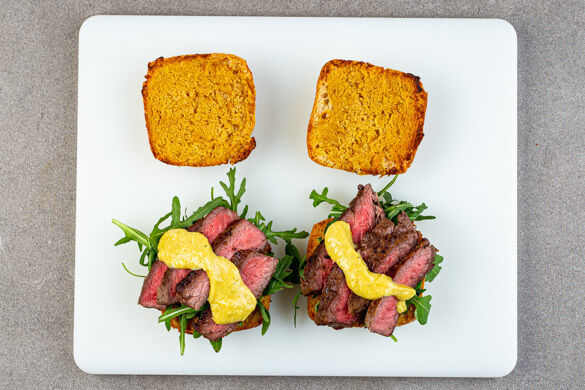 Wir präsentieren den Goliath unter den Sandwichs: Ein echtes Kraftpaket, ausgestattet mit robustem Flanksteak, einer würzigen Käsesauce und pfeffrigem Rucola. In der Ringecke steht auch schon sein kleiner Helfer, ein cremiger Bete-Karotten-Salat, bereit zum Angriff. Da brauchst du einen Bärenhunger, um es mit den beiden aufzunehmen. Also los, Ring frei!