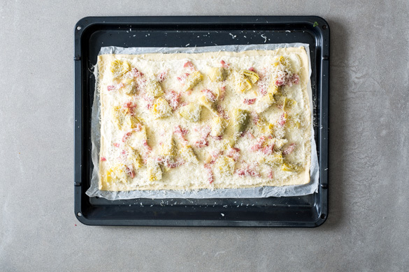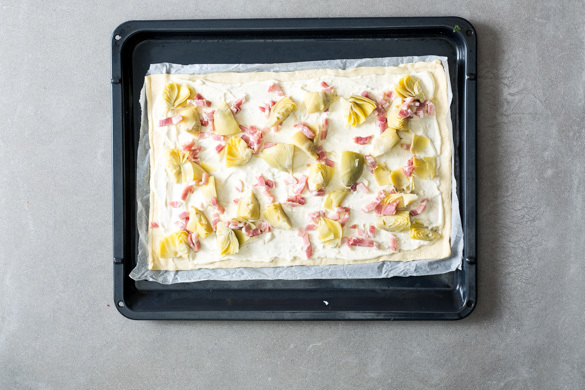 Den Teig mit dem Papier nach unten auf einem Backblech ausrollen und gleichmäßig mit der Knoblauchcreme bestreichen. Dann nach Geschmack mit den Artischocken und dem Speck belegen.