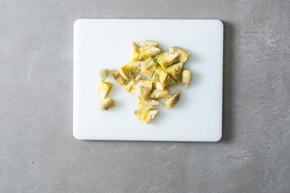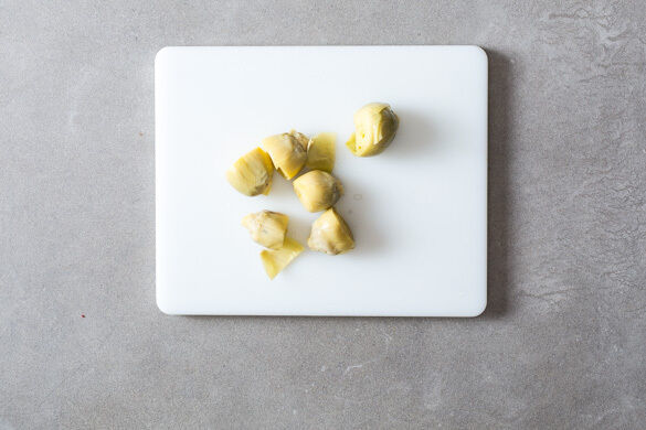 Den Backofen auf 250°C (230°C Umluft) vorheizen. Die Artischocken in ein Sieb abgießen und gut abtropfen lassen.