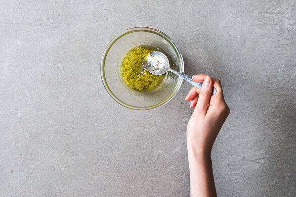 Inzwischen den Knoblauch schälen und fein würfeln, dann mit 2EL Olivenöl und je 1 kräftigen Prise Salz und Pfeffer verrühren.
