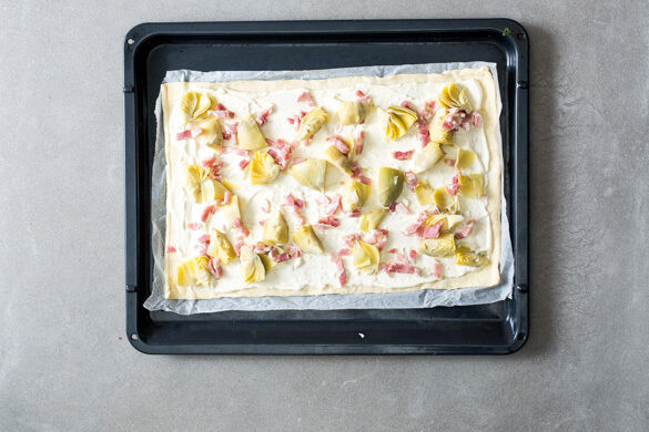 Die Teige mit dem Papier nach unten auf zwei Backblechen ausrollen und gleichmäßig mit der Knoblauchcreme bestreichen. Dann nach Geschmack mit den Artischocken und dem Speck belegen.