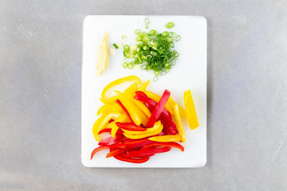 Die Paprika jeweils vierteln, entkernen und in dünne Streifen schneiden. Die Lauchzwiebel in feine Ringe schneiden. Den Ingwer schälen und fein reiben oder sehr fein würfeln.