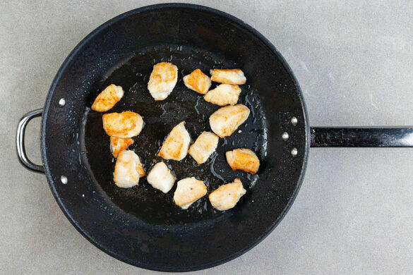 Das Fleisch trocken tupfen, in ca. 2cm große Würfel schneiden und mit je 1/2TL Salz und Pfeffer würzen. In der restlichen Maisstärke wenden, bis es vollständig bedeckt ist. Das Fleisch mit 4EL Pflanzenöl in einer zweiten großen Pfanne bei mittlerer bis starker Hitze 5–6Min. braten, bis es goldbraun und gar ist.