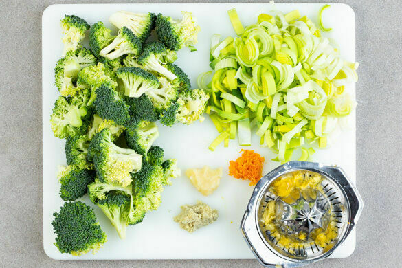 Den Brokkoli in mundgerechte Röschen schneiden. Den Lauch längs halbieren und in feine Streifen schneiden. Den Knoblauch und den Ingwer schälen und fein reiben oder sehr fein würfeln. 2TL Orangenschale abreiben, dann die Orangen halbieren und auspressen.