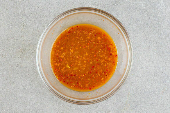 4EL Orangensaft mit 1 Päckchen Maisstärke gut verrühren, bis keine Klümpchen vorhanden sind. Den restlichen Orangensaft, die Orangenschale, 50ml Sojasauce, 1EL Zucker und 7–8EL Wasser dazugeben. 1–2 Prisen Chiliflocken einrühren, wenn etwas Schärfe gewünscht wird.