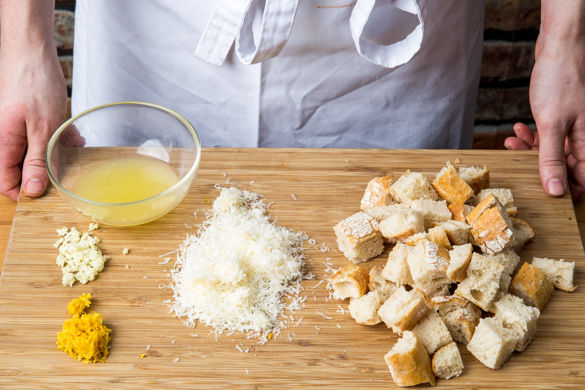 Das Brötchen zuerst in Scheiben, dann in ca. 1–2cm große Würfel schneiden. Den Knoblauch schälen, halbieren und fein hacken. Den Käse reiben. Die Zitronenschale abreiben, dann die Zitrone halbieren und auspressen.
