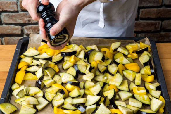 Die Aubergine, Knoblauchscheiben und Paprika auf einem mit Backpapier ausgelegten Blech verteilen und mit 2EL Olivenöl gut durchmischen. Mit Salz und Pfeffer würzen und anschließend ca. 20-25Min. rösten.