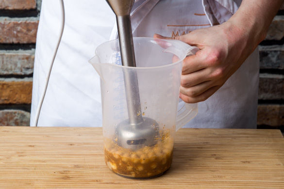 Die Kichererbsen in ein Sieb abgießen und unter kaltem Wasser abspülen. Eine Hälfte der Zitrone entsaften, die andere in Spalten schneiden. Die Hälfte der Kichererbsen mithilfe des Stabmixers mit 1-2EL Zitronensaft, Tahini, einem Päckchen Schawarma-Gewürz, der restlichen Knoblauchzehe und etwas Wasser pürieren. Mit Salz und Pfeffer abschmecken.