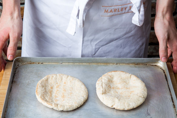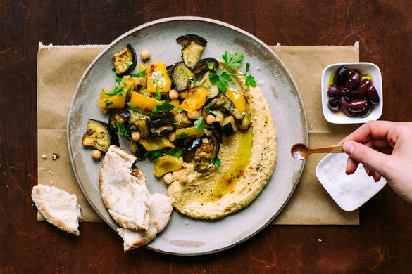 Das deutsche Abendbrot kann so viel mehr sein als eine belegte Brotscheibe mit Wurst und Käse – es kann ganze Kulturen vereinen! Hier haben wir für dich eine Alternative des deutschen Mahlzeitrituals kreiert, die dich begeistern wird! Das warme Pita-Brot wird dick mit selbstgemachtem Hummus bestrichen und mit gegrillter Aubergine und Paprika belegt – dazu gibt es noch saftige Oliven.