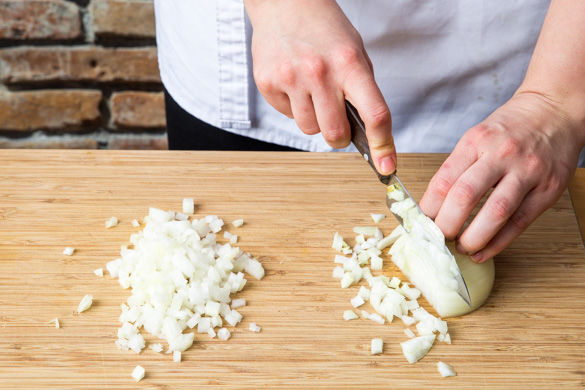Die Zwiebel schälen, halbieren und in feine Würfel schneiden.