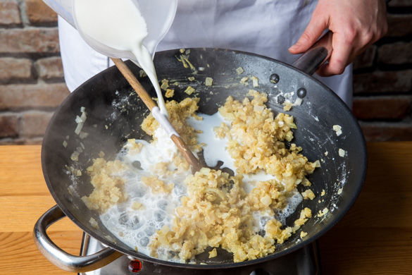 Den Lauch und die Zwiebeln in derselben Pfanne mit 1EL Öl auf mittlerer Hitze 1–2Min. anbraten. Mit der Crème fraîche und 6–8EL Wasser ablöschen, dann ca. die 1/2 des Senfs oder nach Geschmack einrühren. Den Brühwürfel hinzugeben und die Sauce ca. 3–4Min. köcheln lassen. Mit der Gewürzmischung, Salz und Pfeffer abschmecken.