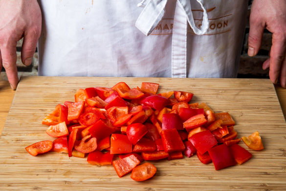 Den Ofen auf 200°C Umluft vorheizen. Die Paprika entkernen und in ca. 2cm große Würfel schneiden.