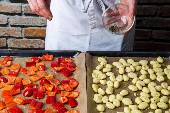 Nun die Gnocchi und die Paprika auf je ein mit Backpapier ausgelegtes Backblech verteilen und beides mit 1-2EL Olivenöl mischen, Paprika mit Salz und Pfeffer abschmecken. Beides im Ofen für ca. 20-25Min. rösten, bis die Gnocchi goldgelb sind und die Paprika gar ist. Zur Hälfte der Garzeit die Bleche einmal tauschen.