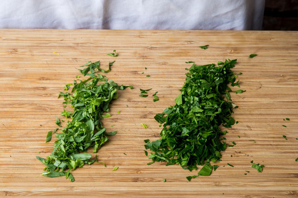 Inzwischen den Basilikum und die Petersilie in feine Streifen schneiden. Knoblauch schälen, dann fein hacken oder fein reiben.