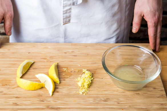 Die Schale einer halben Zitrone abreiben und entsaften, die andere Hälfte in Spalten schneiden.