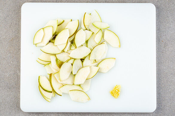Das Fleisch aus dem Kühlschrank nehmen und Raumtemperatur annehmen lassen. In einem mittelgroßen Topf 800ml leicht gesalzenes Wasser für den Reis zum Kochen bringen. Die Birnen vierteln, entkernen und quer in dünne Scheiben schneiden. Den Knoblauch schälen und fein würfeln.