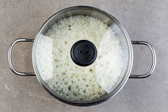 Den Reis in einem Sieb kalt abspülen, bis das Wasser klar bleibt. Sobald das Wasser kocht, den Reis hineingeben und abgedeckt bei niedrigster Hitze 10–12Min. kochen, bis das Wasser aufgesogen und der Reis gar ist. Noch ca. 5Min. ohne Hitzezufuhr ziehen lassen.