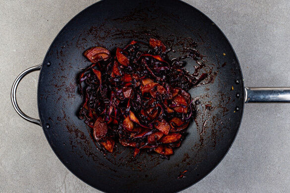 Den Rotkohl, die Birnen und den Knoblauch in einer großen Pfanne oder einem Wok mit 2EL Pflanzenöl bei mittlerer bis starker Hitze in 6–7Min. weich braten, dabei gelegentlich umrühren. Die Chilipaste, die Sojasauce und 2TL Essig einrühren. Den Rotkohl 2–3Min. weitergaren, dann mit Salz abschmecken und abgedeckt warm halten.