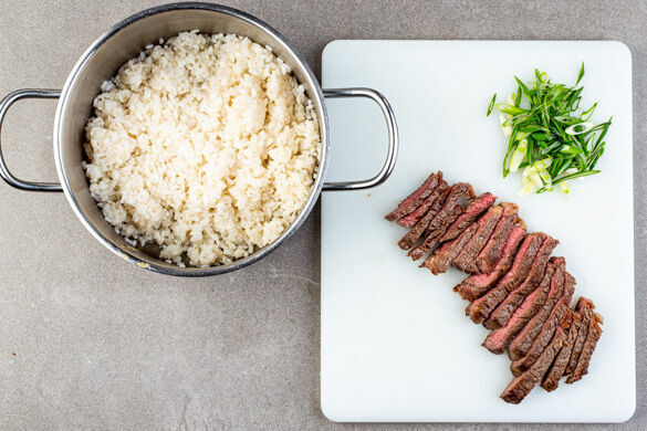 Das Fleisch trocken tupfen und in einer zweiten großen Pfanne mit 2EL Pflanzenöl bei starker Hitze auf jeder Seite 2–3Min. braten, abhängig davon, ob es medium oder eher durchgebraten sein soll. Auf jeder Seite mit 1 Prise Salz würzen. Die Lauchzwiebeln in feine Ringe schneiden.