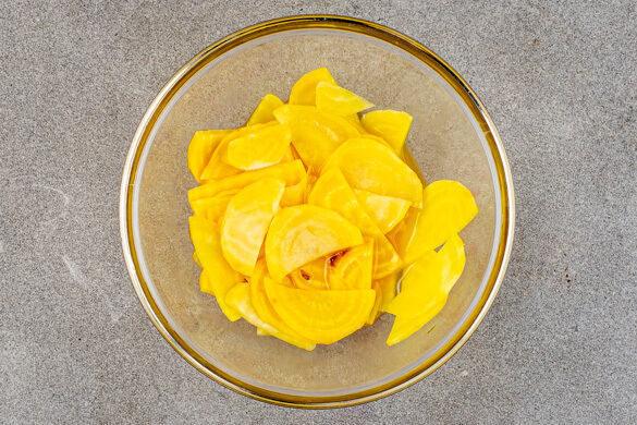 In einem kleinen Topf 300ml leicht gesalzenes Wasser für den Bulgur zum Kochen bringen. Die Bete schälen, halbieren und mit einem Messer oder Sparschäler in dünne Scheiben schneiden. In einem zweiten kleinen Topf 3EL hellen Essig, 2EL Wasser, 2TL Zucker und 1/2TL Salz aufkochen. Die Bete zugeben und ca. 2Min. kochen lassen, dann vom Herd nehmen und ziehen lassen.