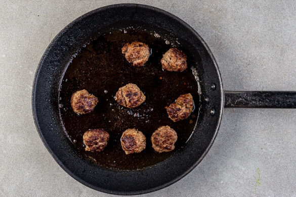 Das Hackfleisch gründlich mit 1EL Senf sowie je 1 kräftigen Prise Salz und Pfeffer verkneten und zu 8 walnussgroßen Hackbällchen formen. Die Hackbällchen in einer mittelgroßen Pfanne mit 1TL Olivenöl bei mittlerer bis starker Hitze in 8–10Min. rundum goldbraun und gar braten.