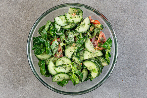 Die Gurke und die Tomate längs halbieren und quer in dünne Scheiben schneiden. Den Dill samt Stängeln fein schneiden.