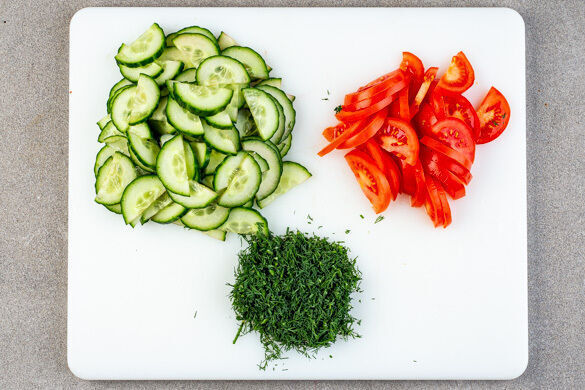 Die Gurke und die Tomaten längs halbieren und quer in dünne Scheiben schneiden. Den Dill samt Stängeln fein schneiden.